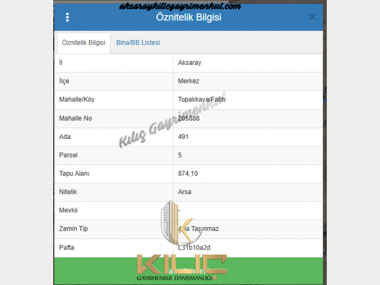 874 m² Tapu Alanı