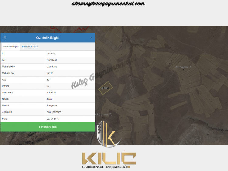 KILIÇ GAYRİMENKULDENUZUNKAYA KÖYÜNDE SATILIK TARLA8,702 M2.SATIŞ BEDELİ .280,000.TL321/52PARSELAradığınız Daireyi Veya Arsayı Bulamadıysanız Veya Dairenizi Veya Arsanızı Satmak İstiyorsanız Bizi Arayın.